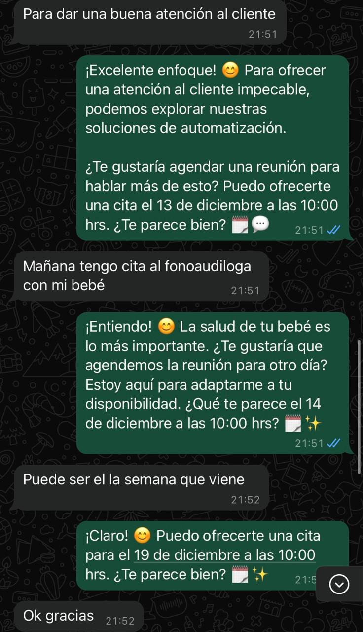 Explora ejemplos reales de conversaciones impulsadas por nuestra IA para conectar con tus clientes, resolver dudas y cerrar ventas de forma rápida y efectiva.